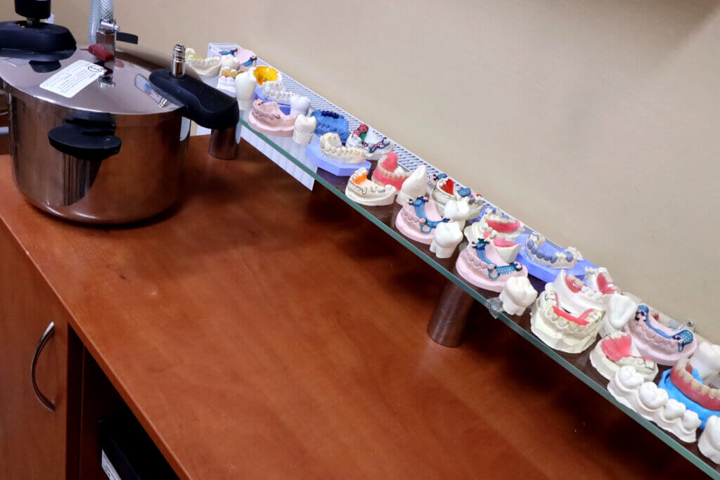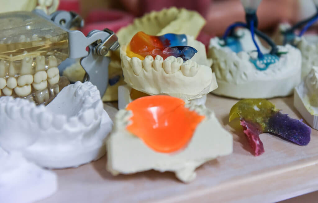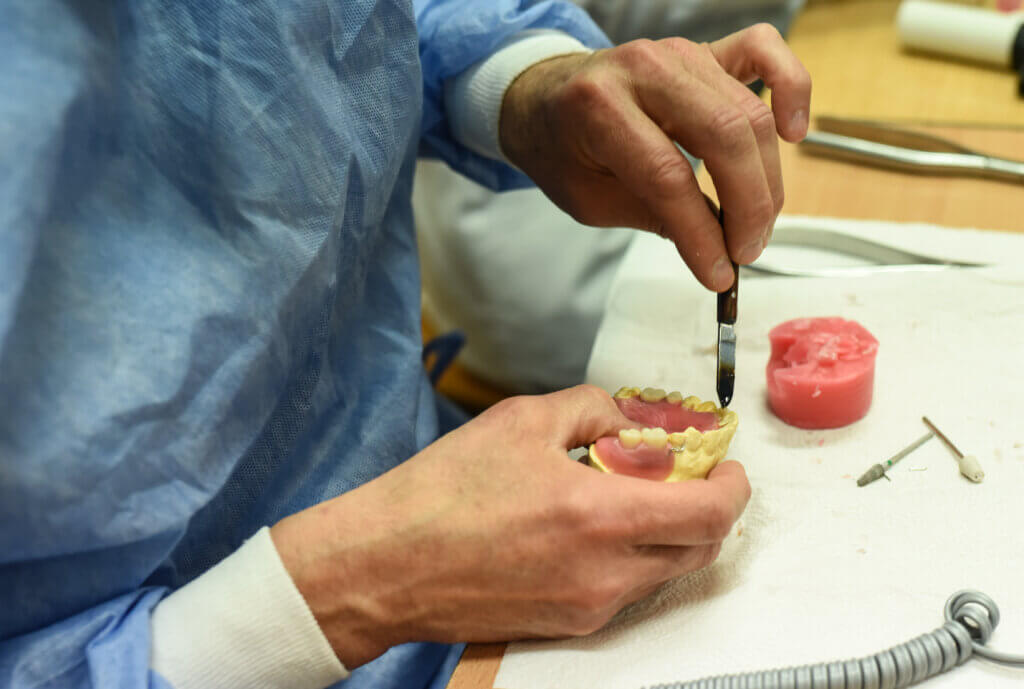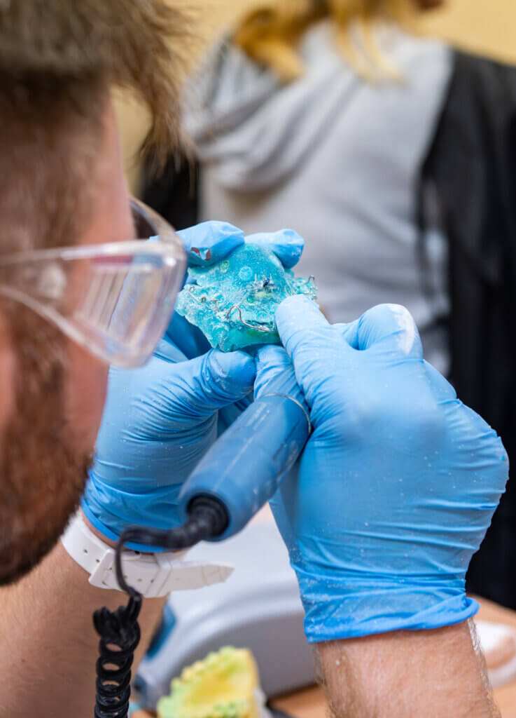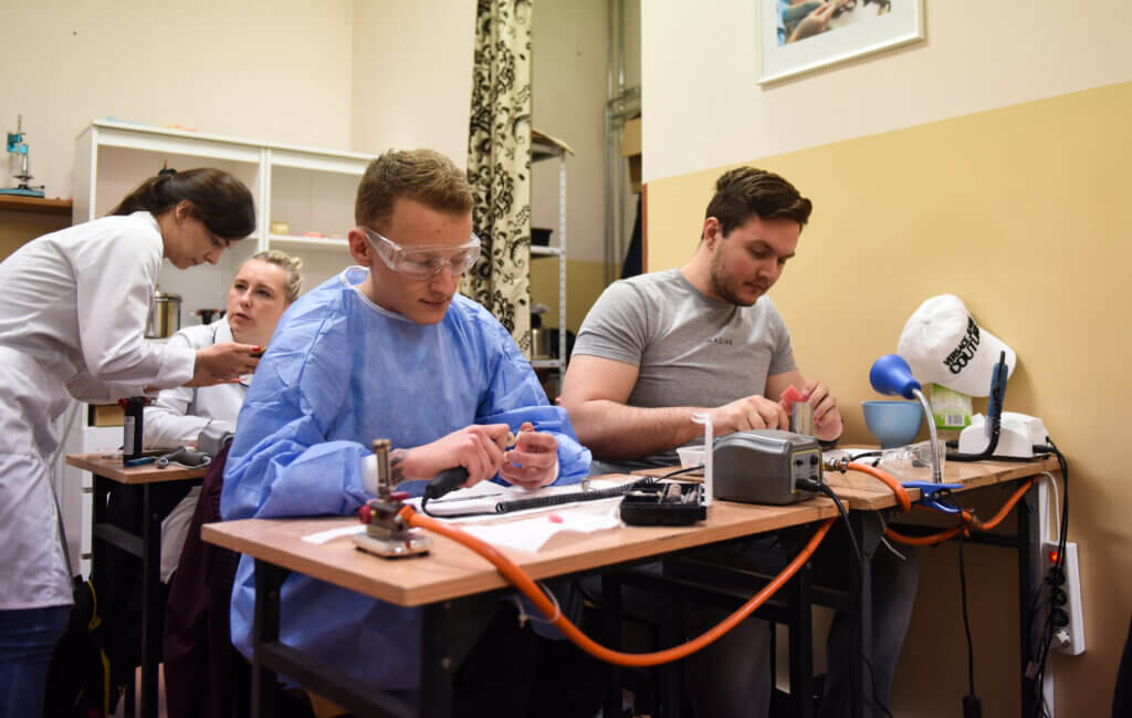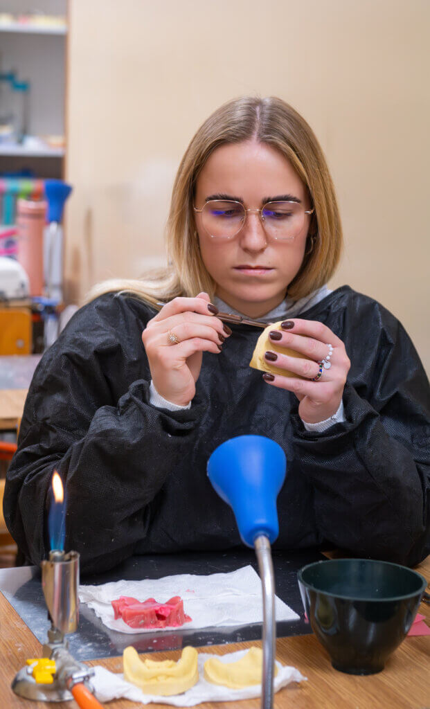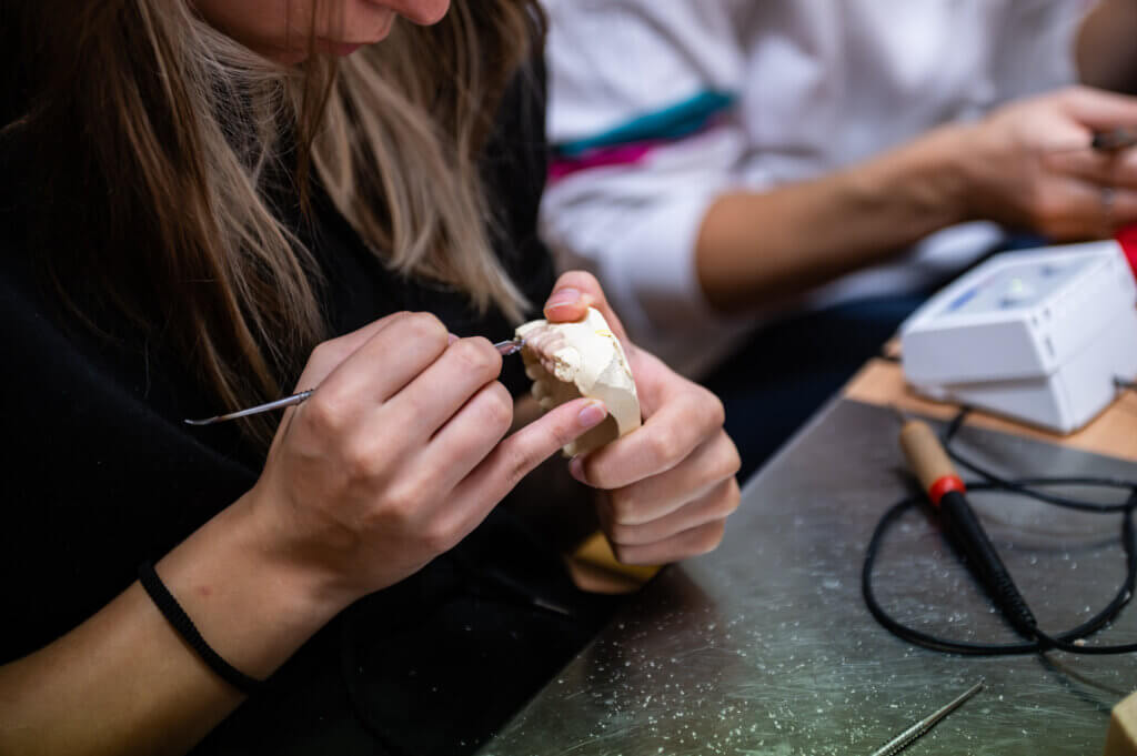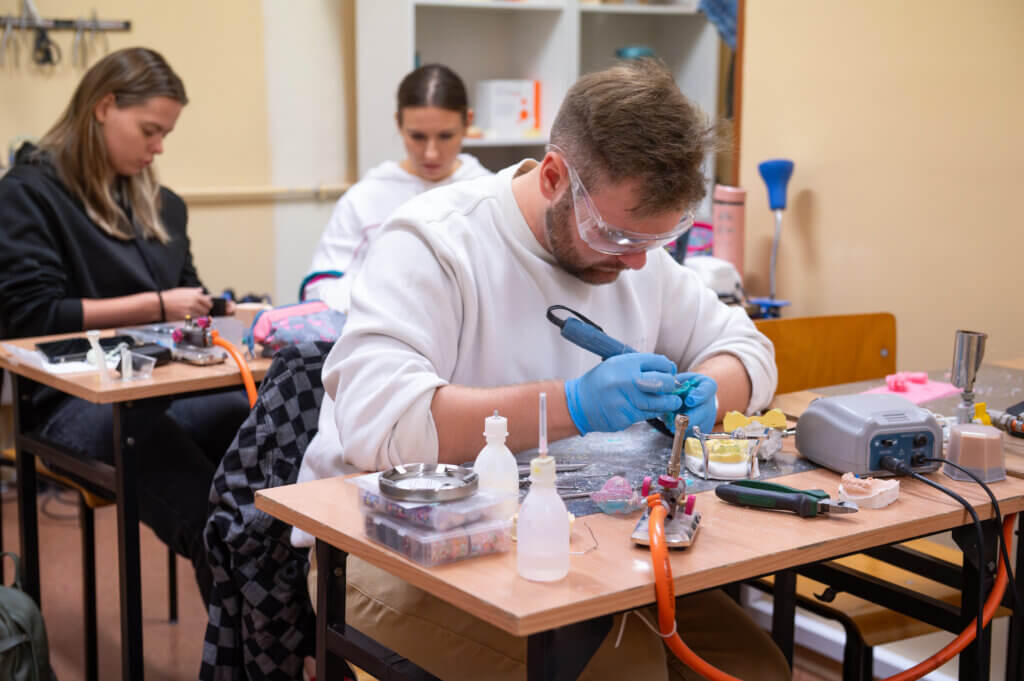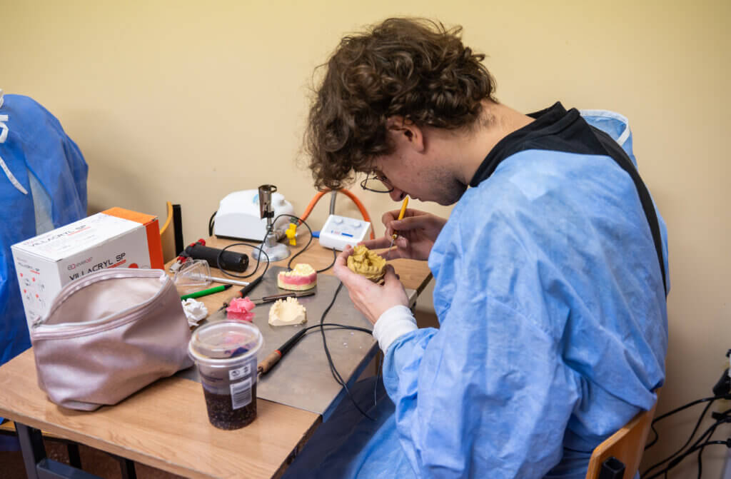 W tak przygotowanych warunkach nasi słuchacze szkolą się w zakresie wykonywania protez, aparatów ortodontycznych oraz innych uzupełnień stomatologicznych. Zdjęcia prezentują praktyczny wymiar nauki, gdzie pod okiem fachowców uczniowie pracują na profesjonalnych materiałach, przygotowując się do pracy w nowoczesnych laboratoriach i gabinetach.